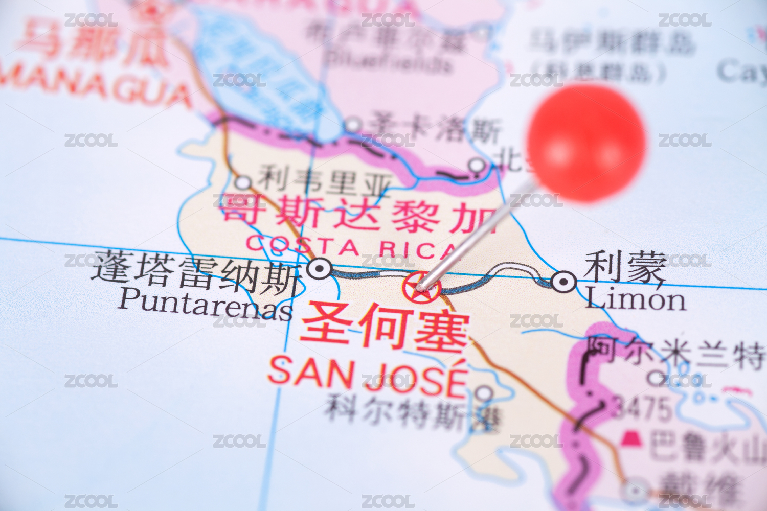 图钉标注哥斯达黎加首都圣何塞在地图上的位置