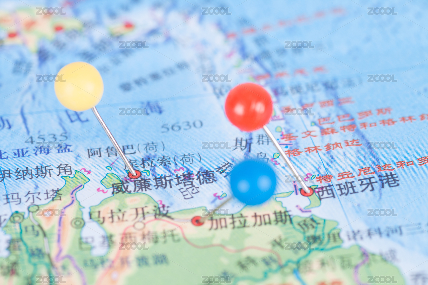 一枚大头钉在地图上标注库拉索首府威廉斯塔德的位置