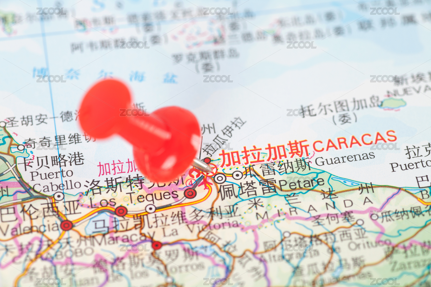 大头钉在地图上标注着委内瑞拉首都加拉加斯的位置