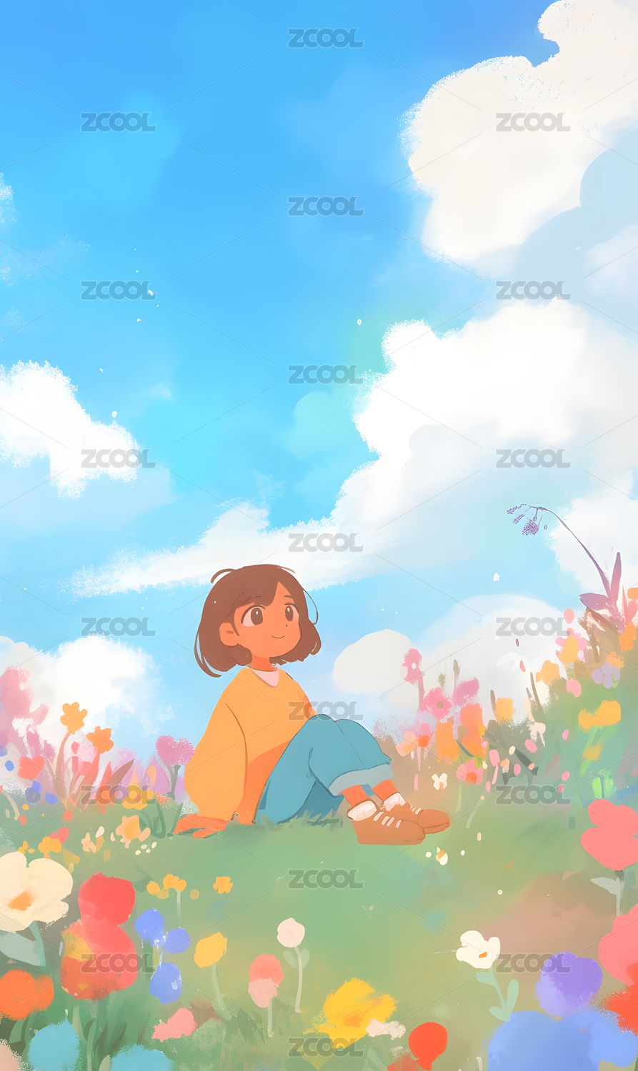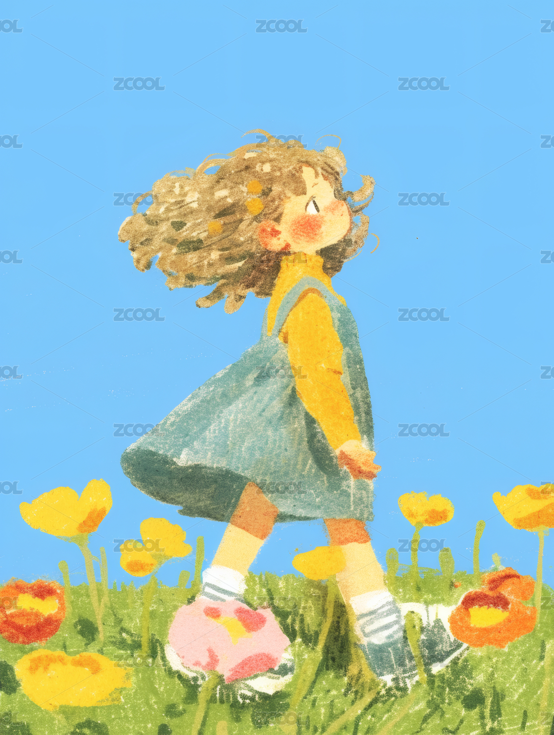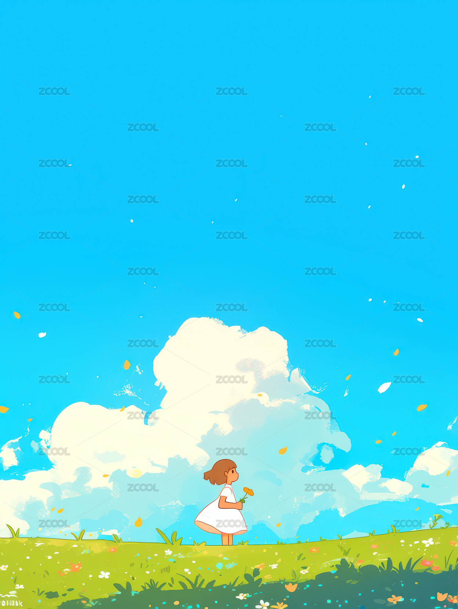 大波斯菊盛开的山坡和穿黄裙子的女孩