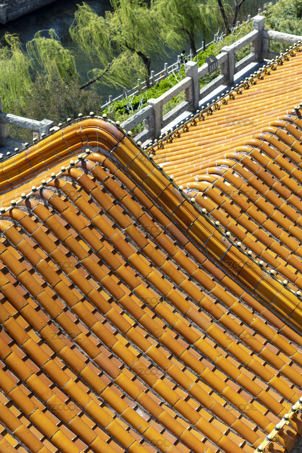 中国北京冬季颐和园佛香阁建筑屋顶琉璃瓦特写