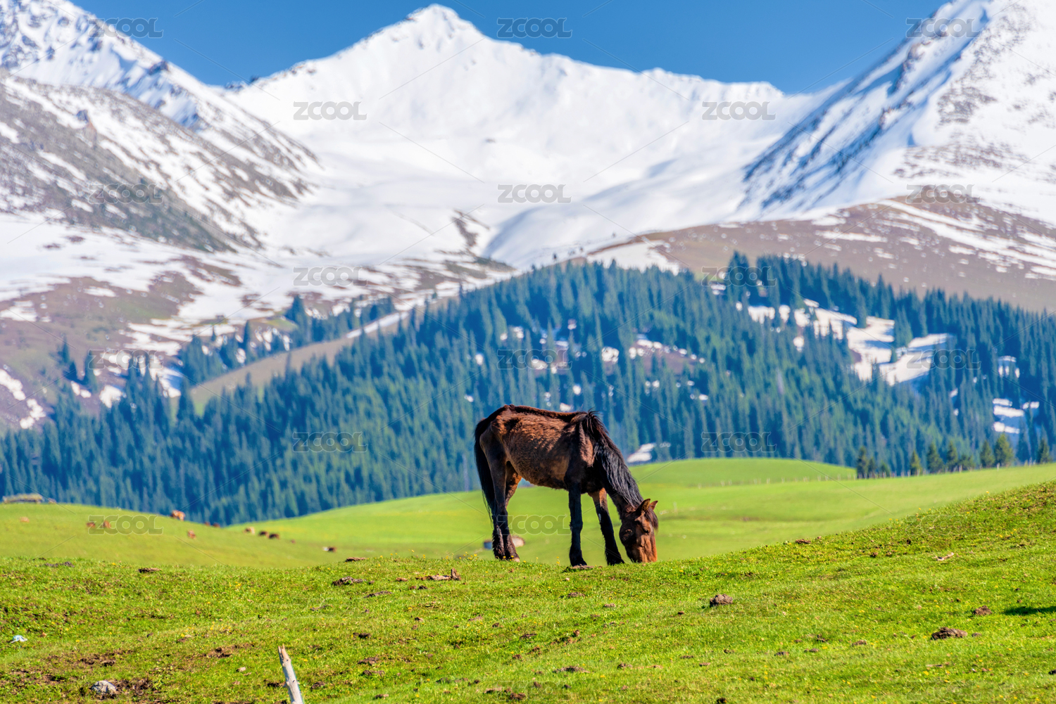 中国新疆伊犁恰西草原雪山牧场马自然风光