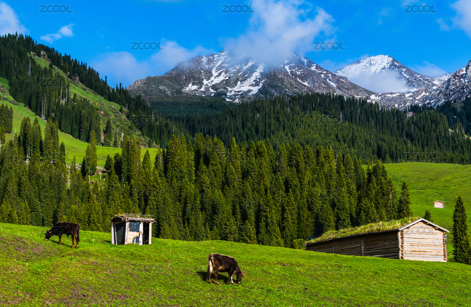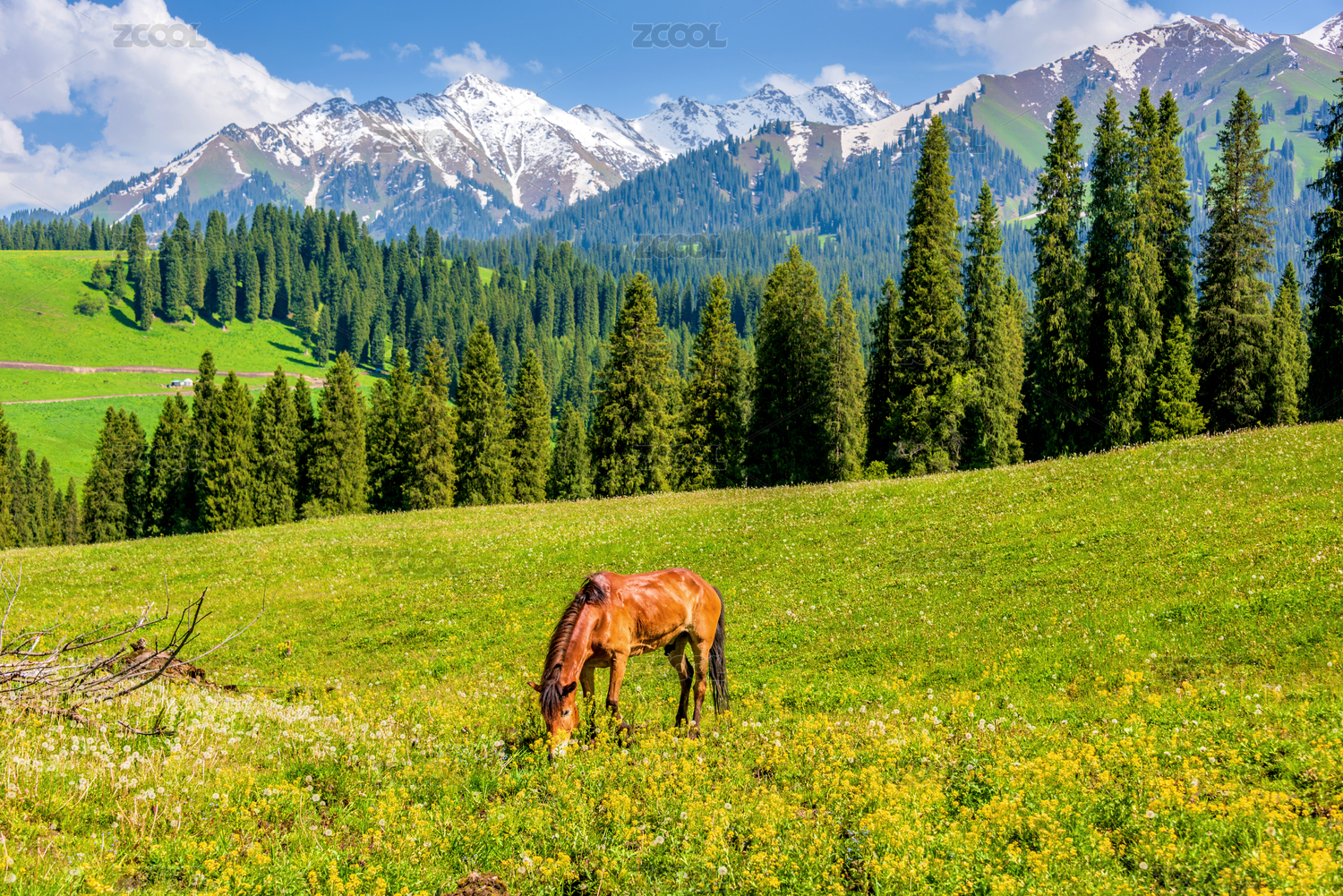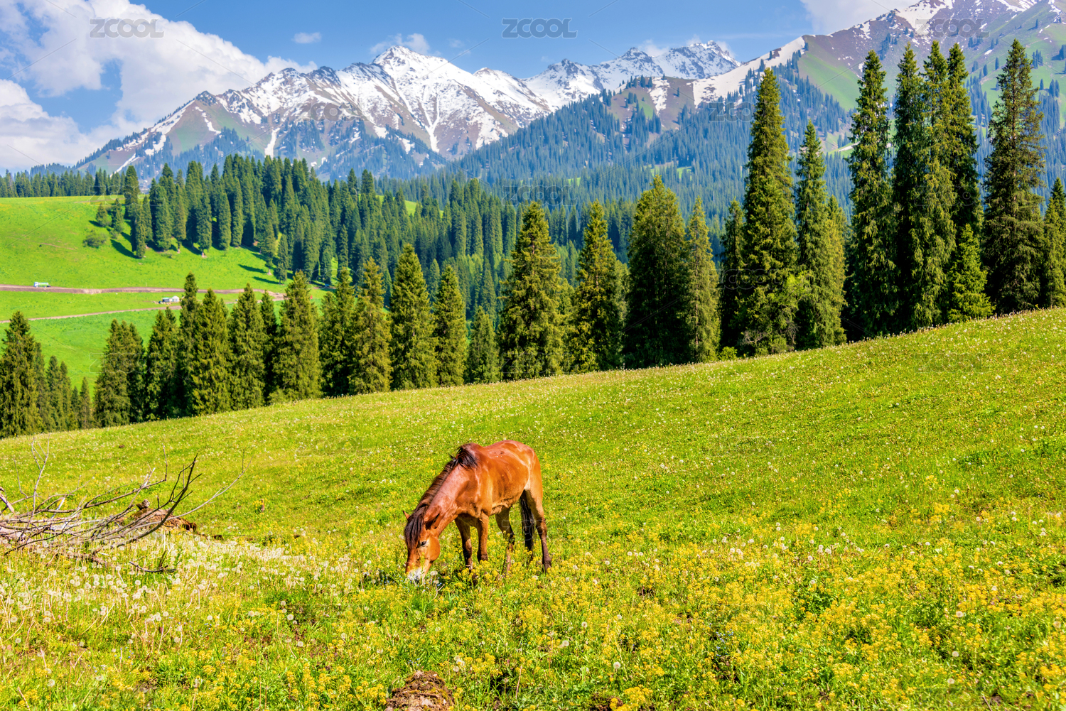 中国新疆伊犁琼库什台雪山森林草原牧场马