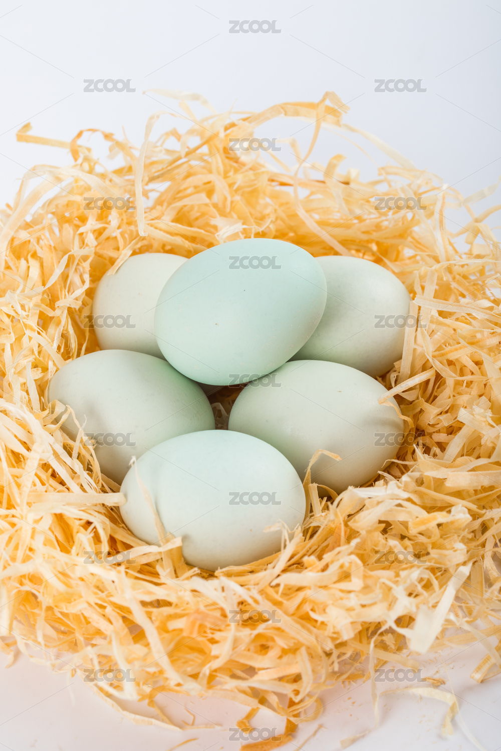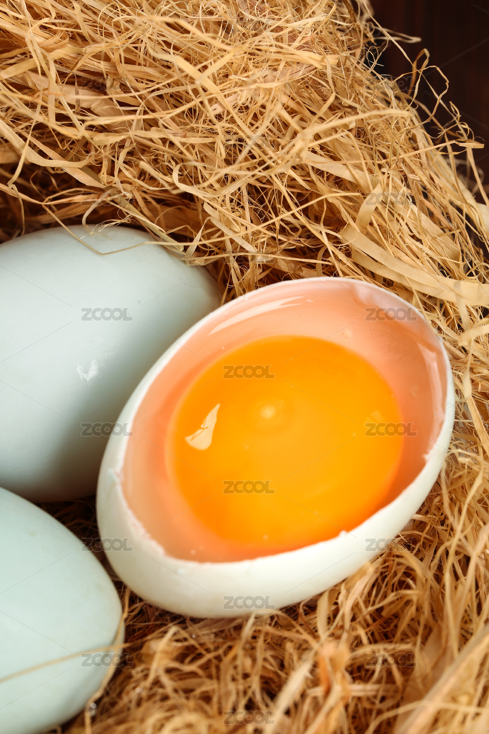 草窝中的几个鸡蛋上放着半个敲开的绿皮鸡蛋