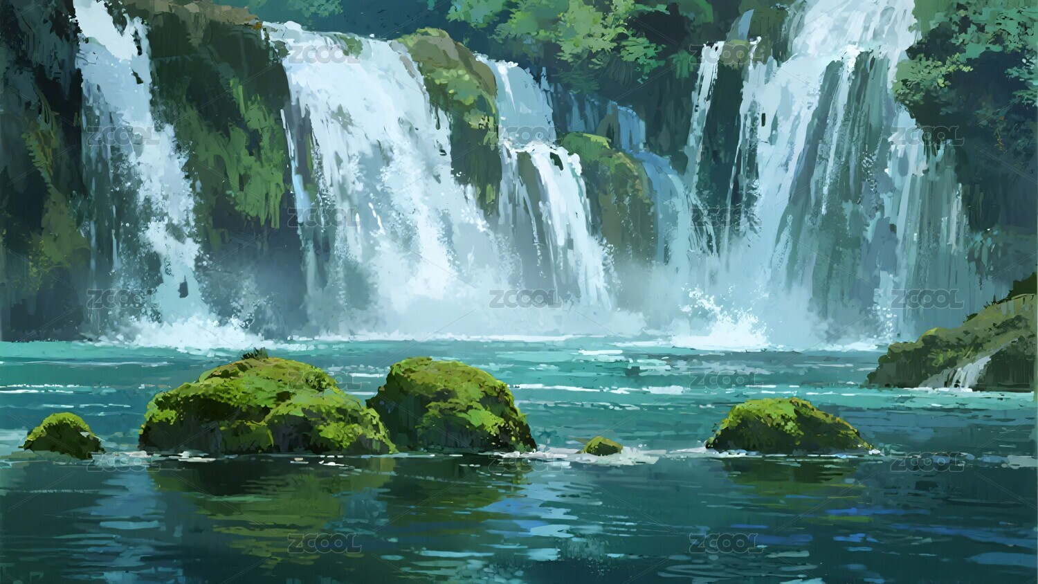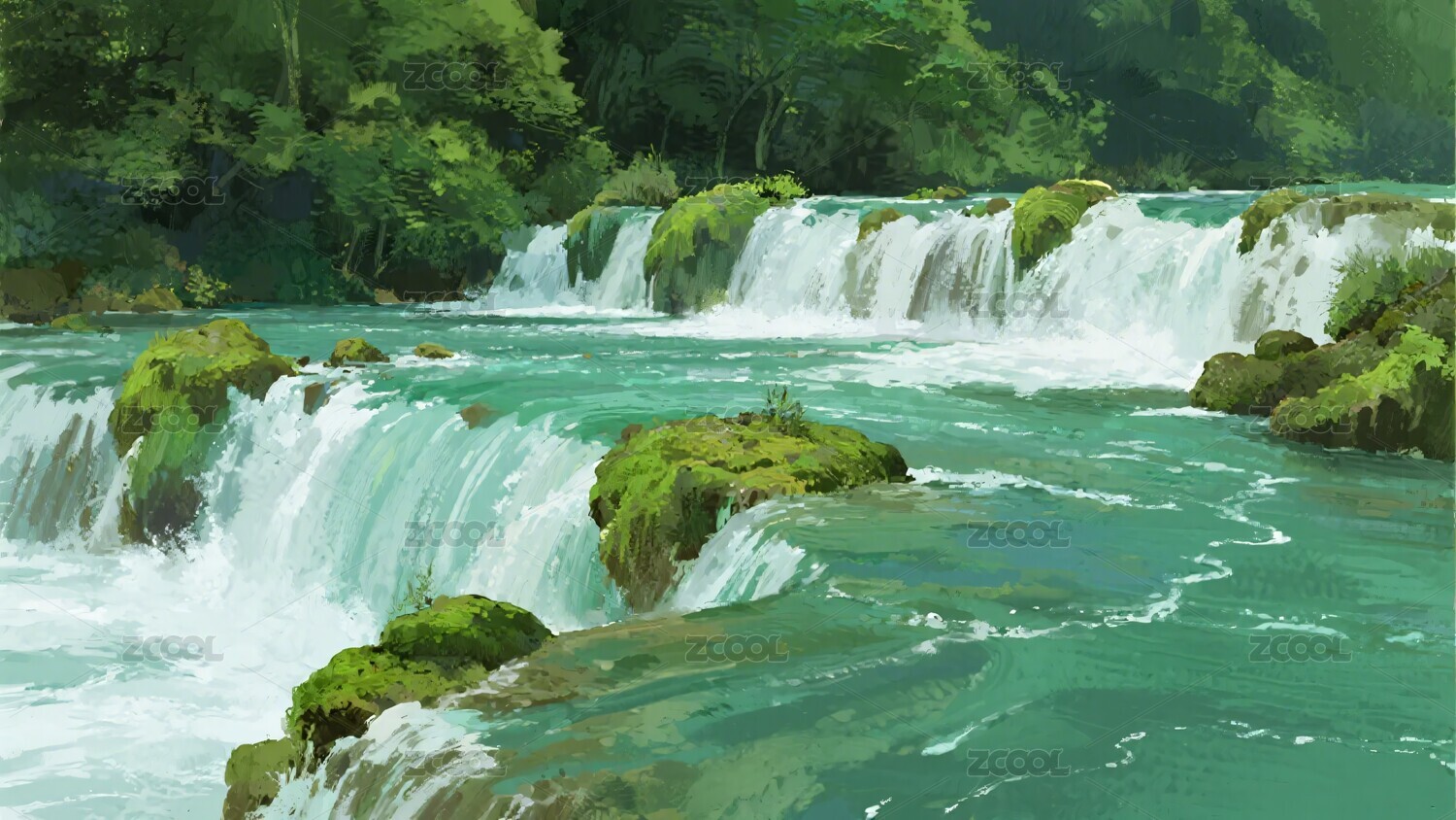 唯美自然瀑布插画风景