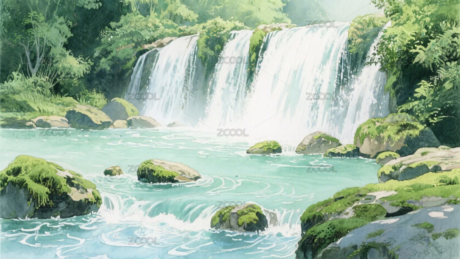森林瀑布水彩插画