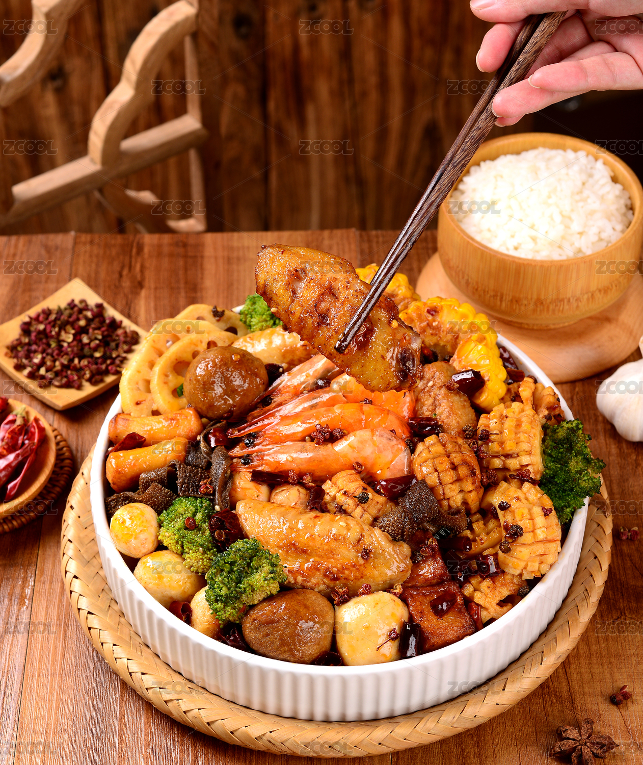 麻辣香锅,干锅冒菜,冒菜,红油冒菜,北极虾,西蓝花,鹌鹑蛋,鱿鱼花,海鲜,麻辣
