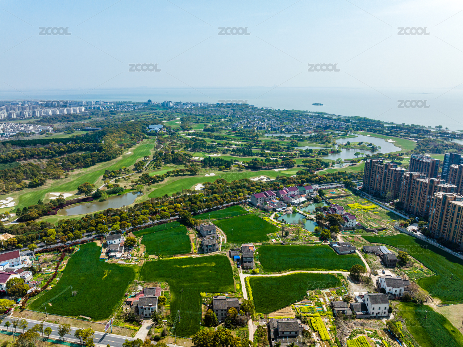 航拍城市别墅群与云南滇池景观