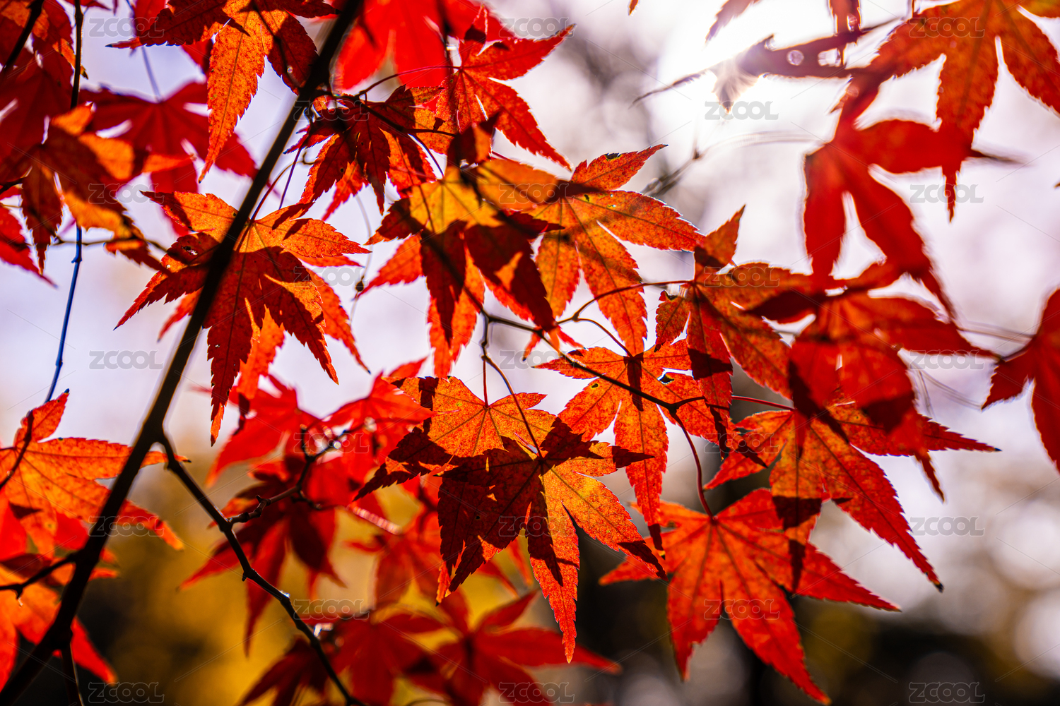 特写侧逆光情况下深秋时的红枫树叶