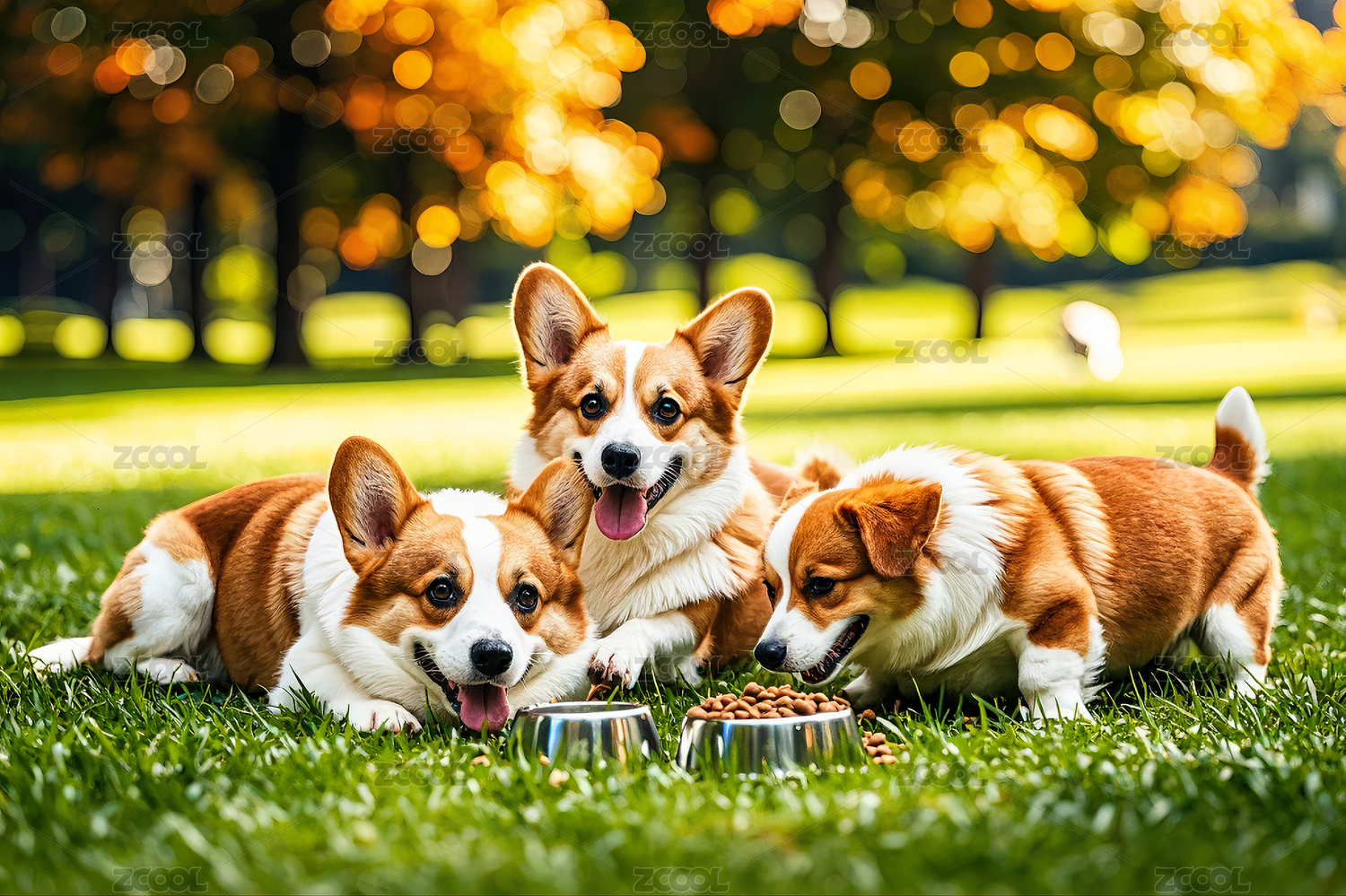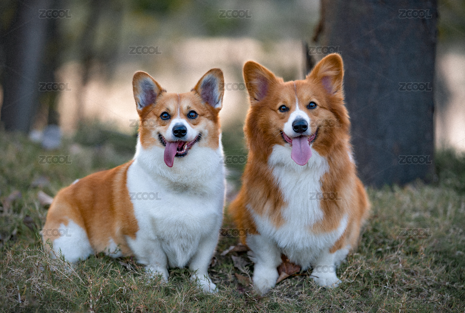 树林里,两只柯基狗并排坐在一起,吐着舌头