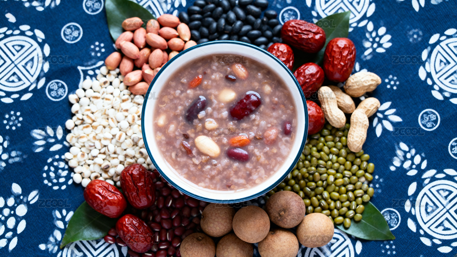 一碗八宝粥和背景里散落的红枣