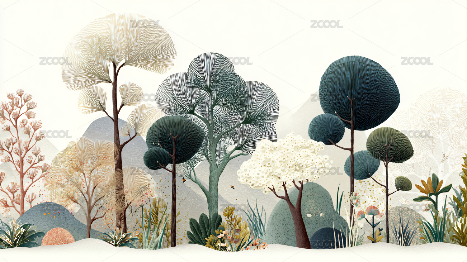 浅底林石山水插画质感画面