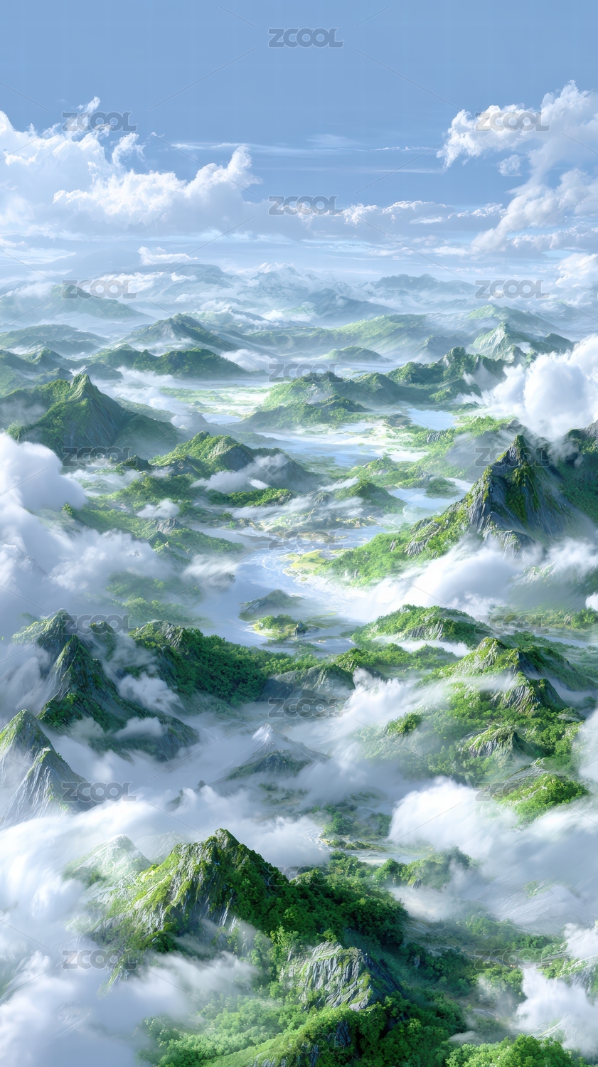 云海缭绕的翠绿山峦美景
