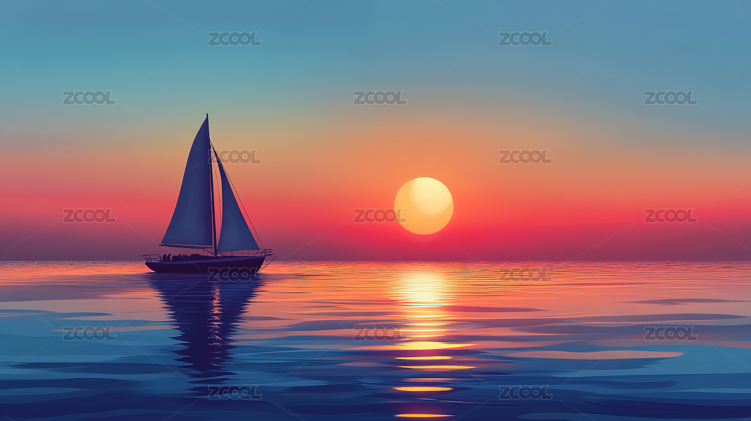 航拍视角下日落晚霞大海中航行的一艘帆船