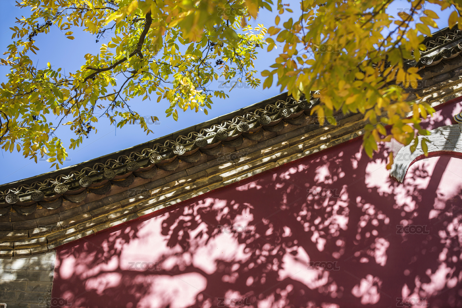 阳光下的古建筑朱红色外墙上的光影和爬山虎植物