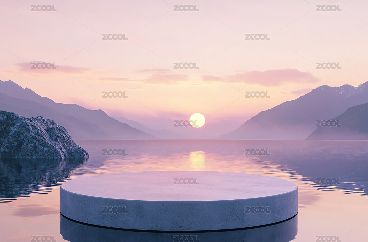 3D蓝色户外高山湖水风景圆形电商产品展台