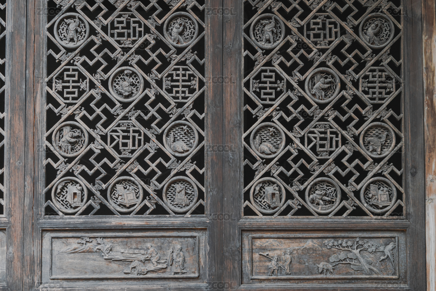徽派民居雕花美人靠木门窗,安徽潜口民宅