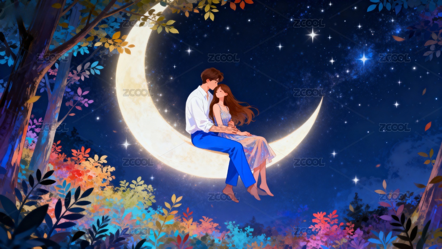 蓝紫色星空背景一轮弯月下一对牵手的情侣