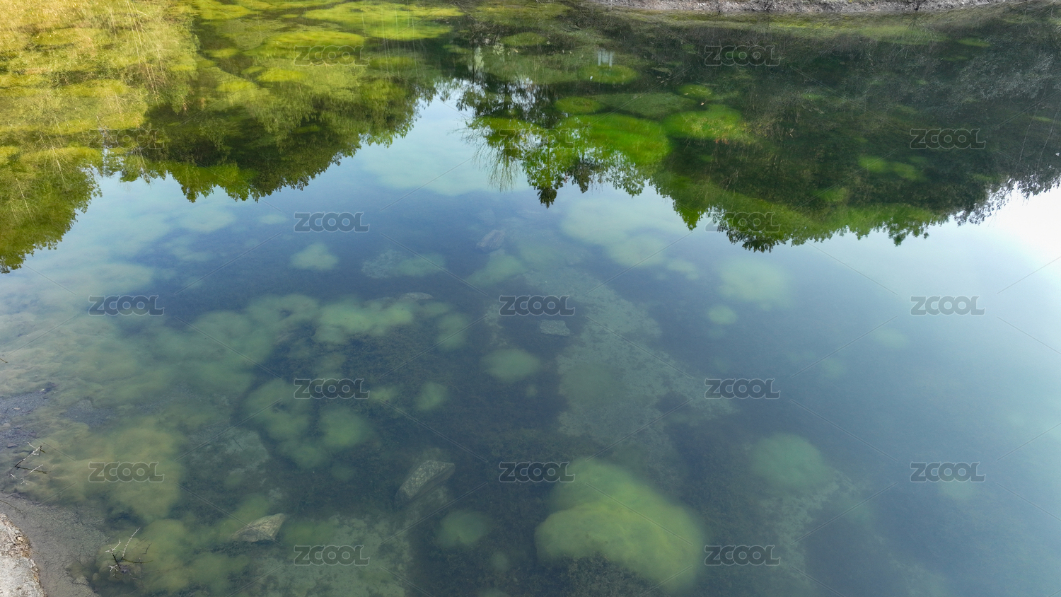 晴朗天气蓝天白云下的树木和水面倒影背景图