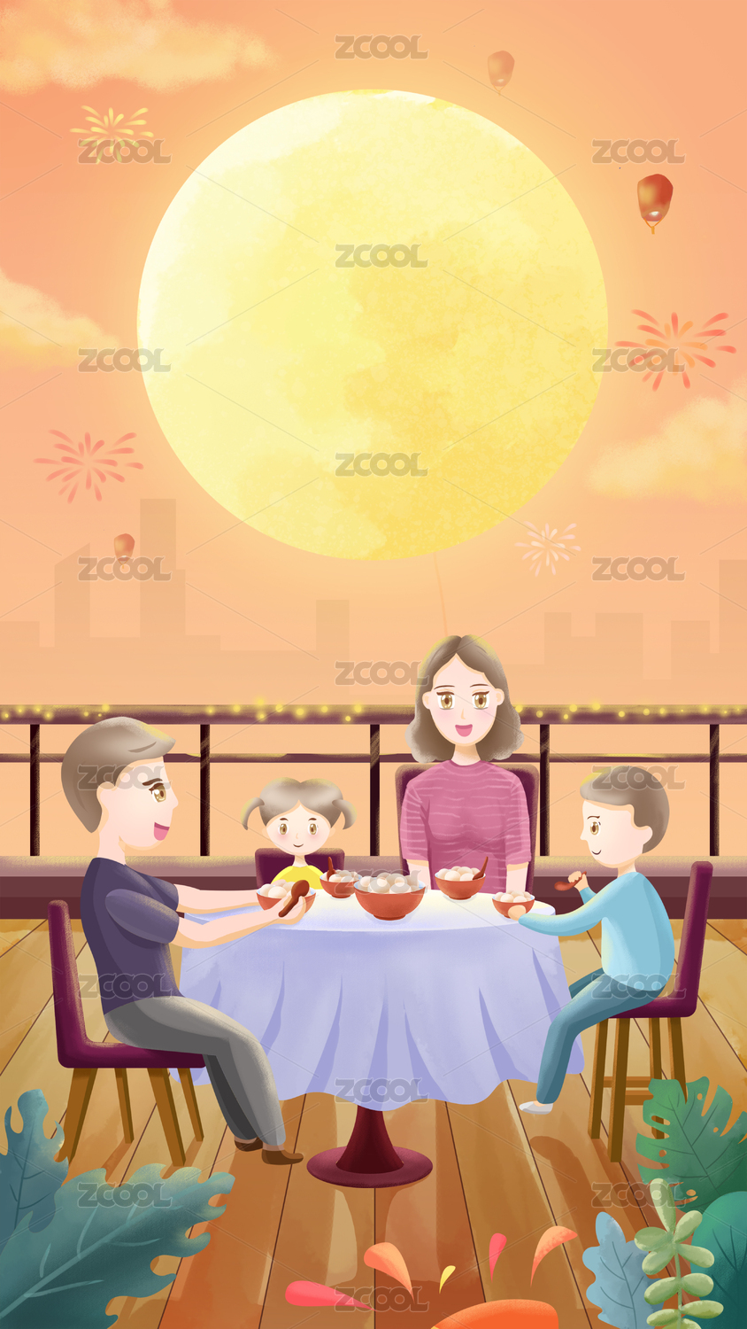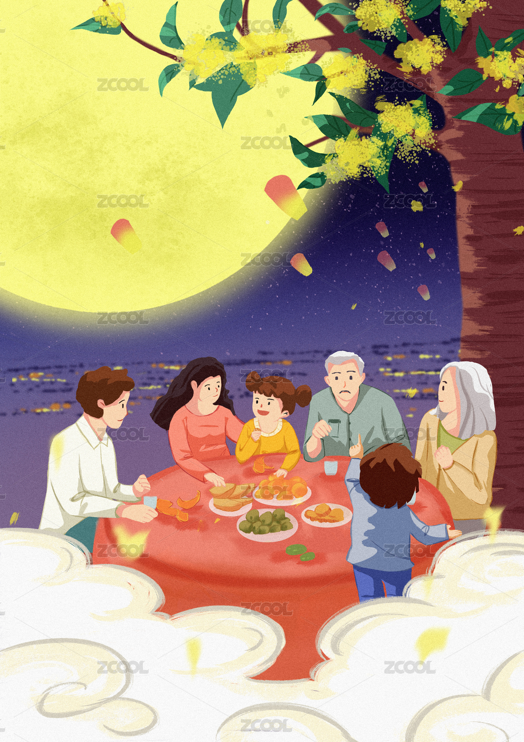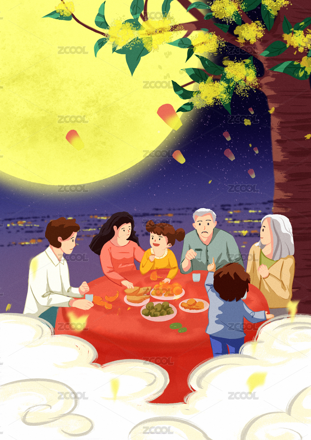 插画,团聚,中秋节,花好,月圆,月亮,家人,爸爸,妈妈,哥哥
