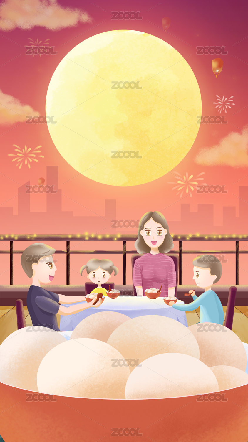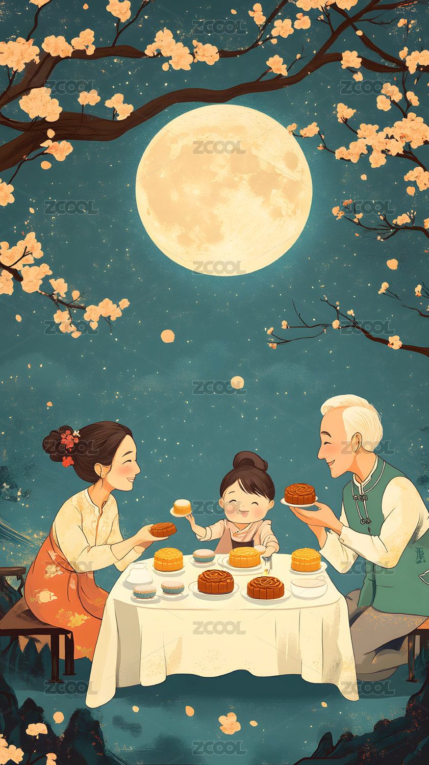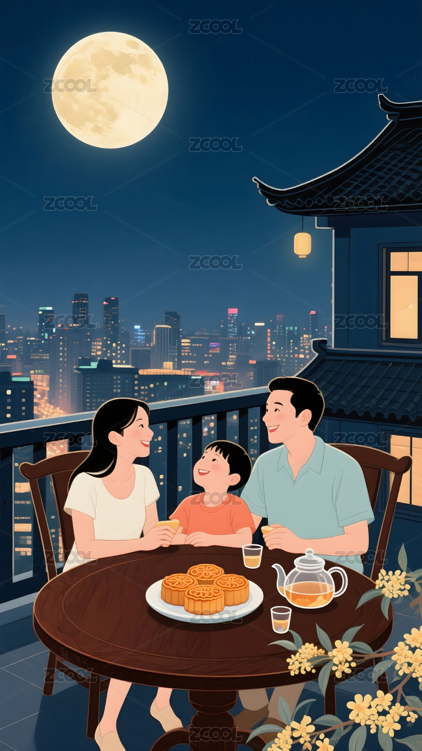 插画,团聚,中秋节,花好,月圆,月亮,家人,爸爸,妈妈,哥哥