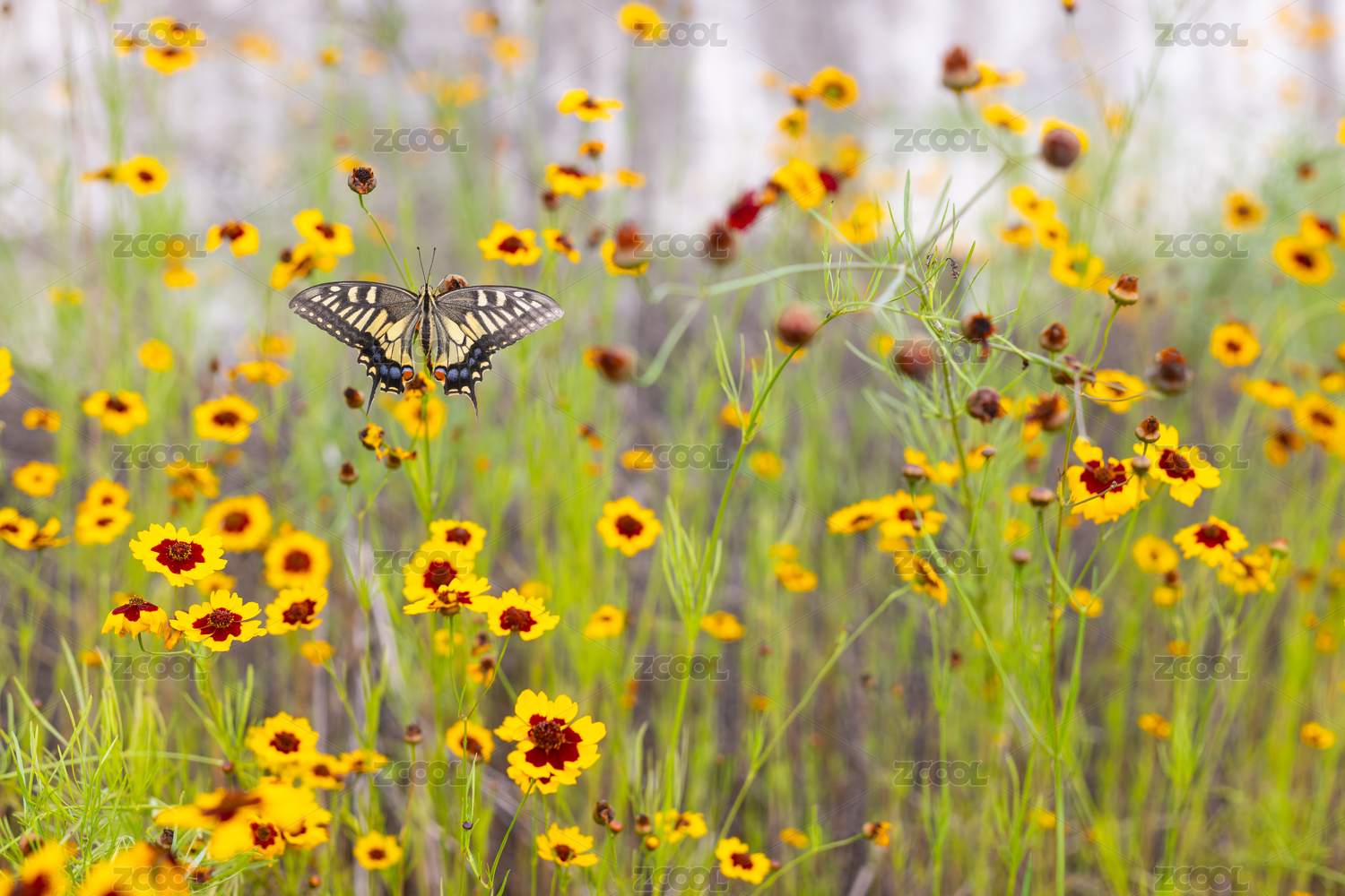 蝴蝶栖息在野外盛开的金鸡菊花朵上