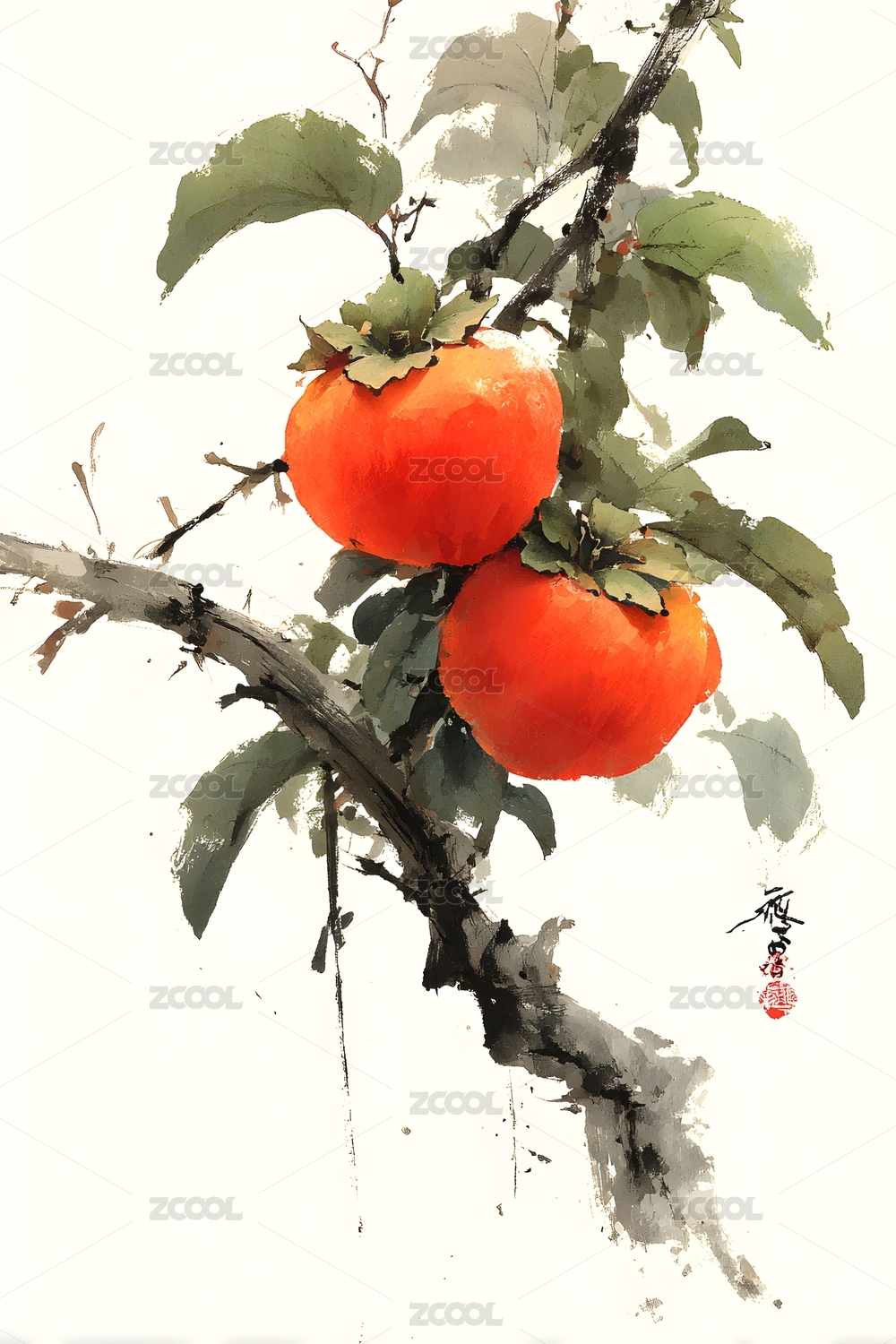 秋天霜降节气柿子树上的鸟插画背景壁纸
