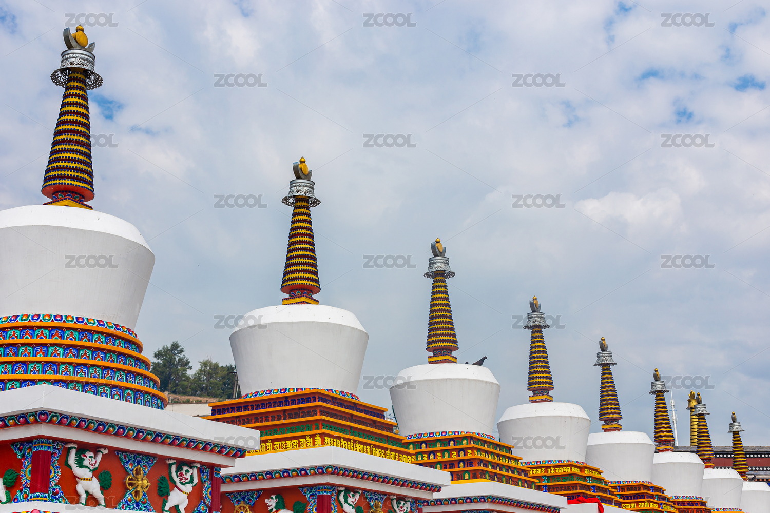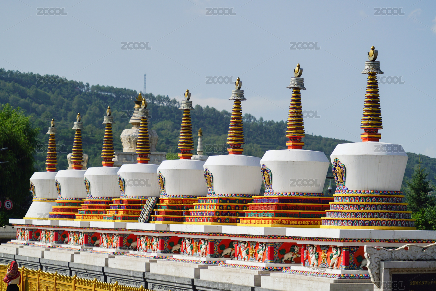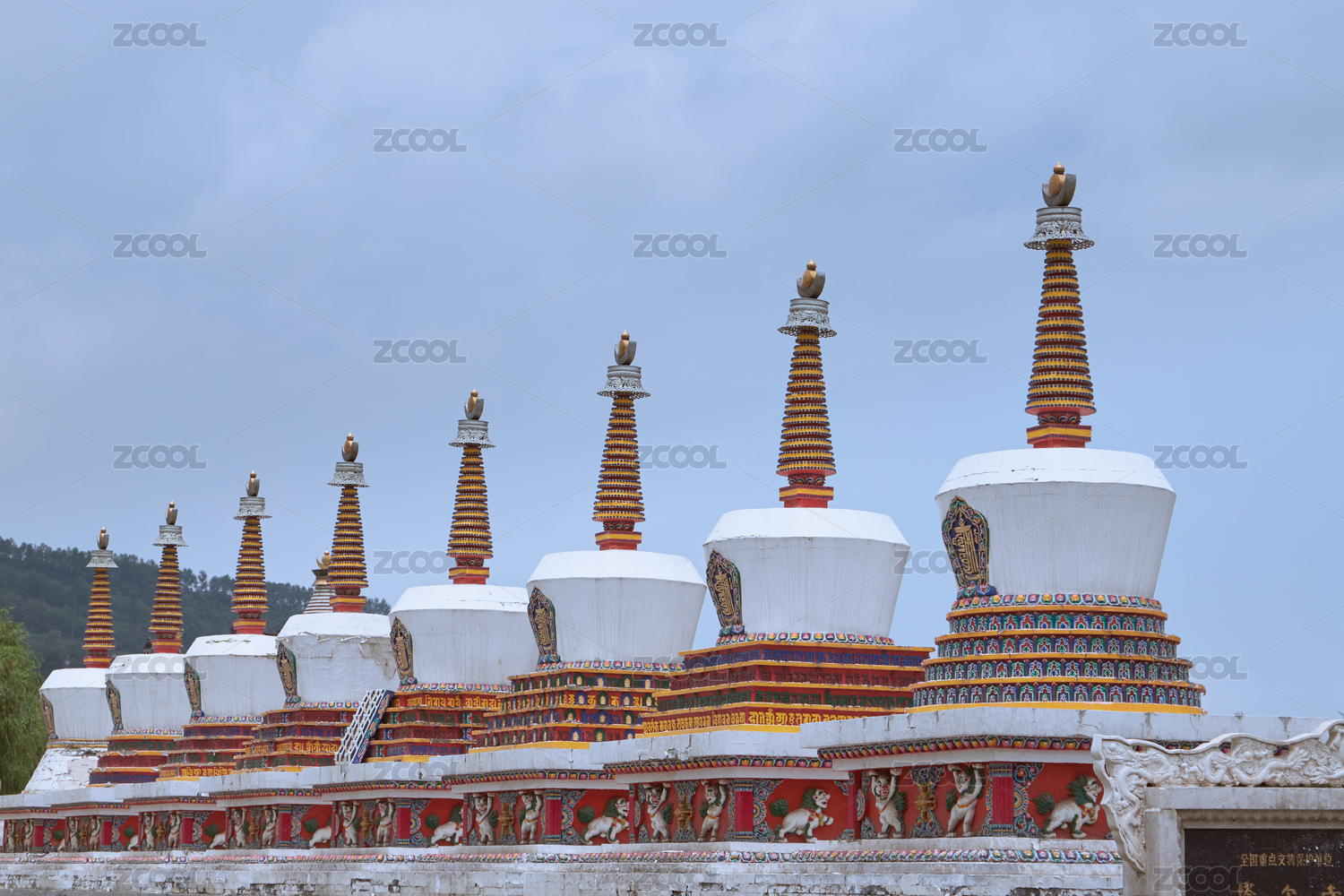 天空下青海省湟中塔尔寺入口处的的白色菩提塔