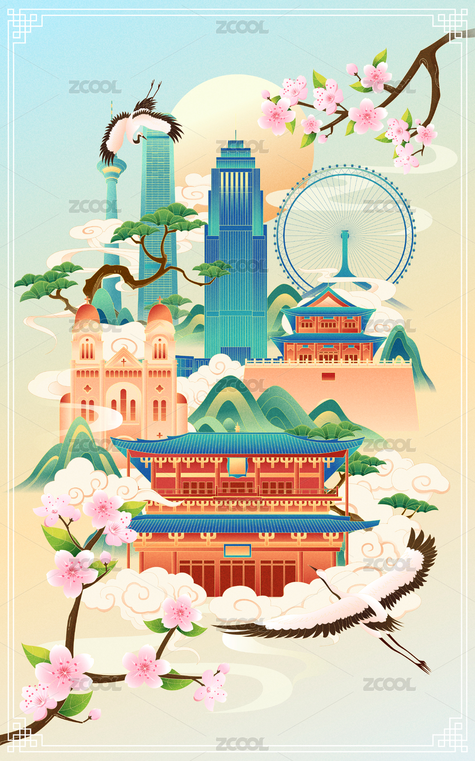 建筑,旅游,城市,风景,桃花,仙鹤,祥云,城市天际线,地标,旅行