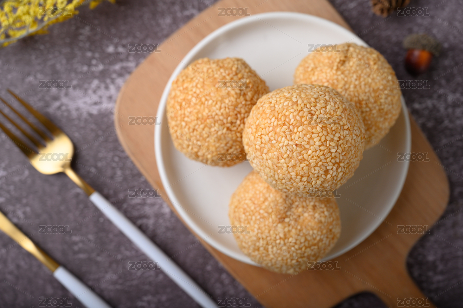 桌面上的白色陶瓷盘子里的美味可口的煎堆