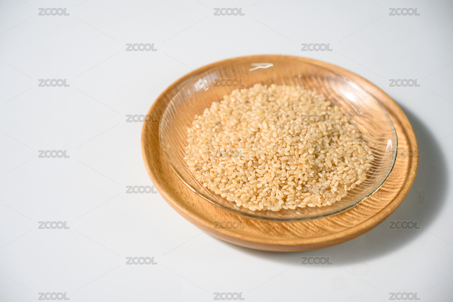 桌面上的玻璃盘子里的新鲜干爽的糙米