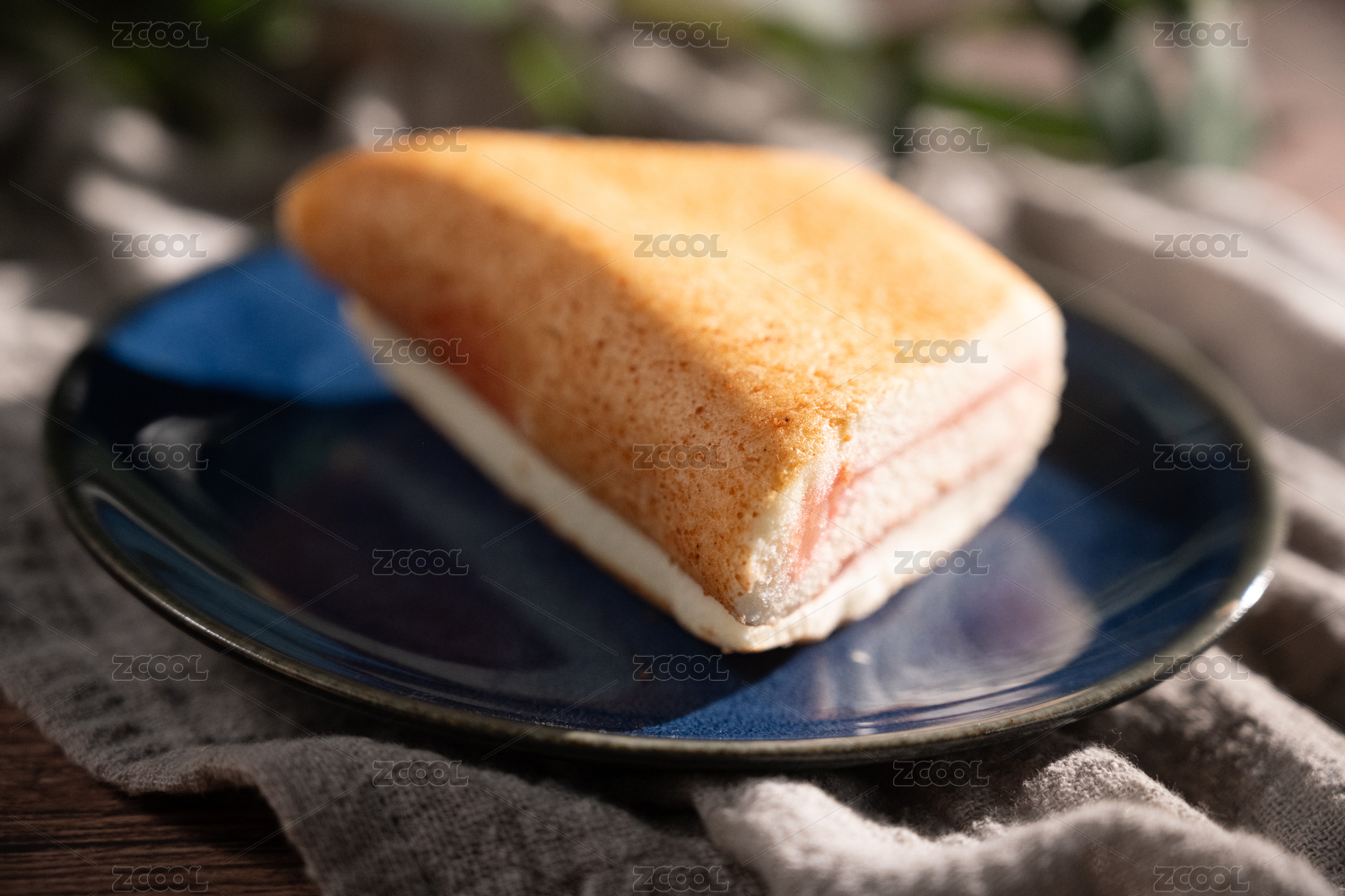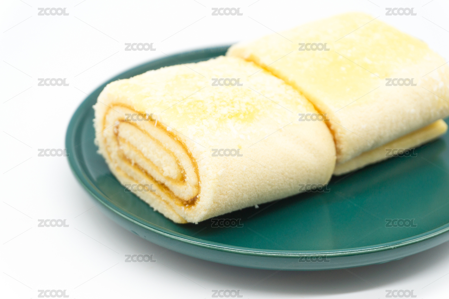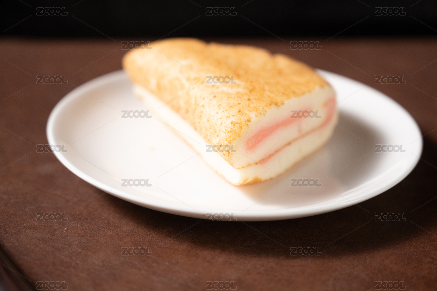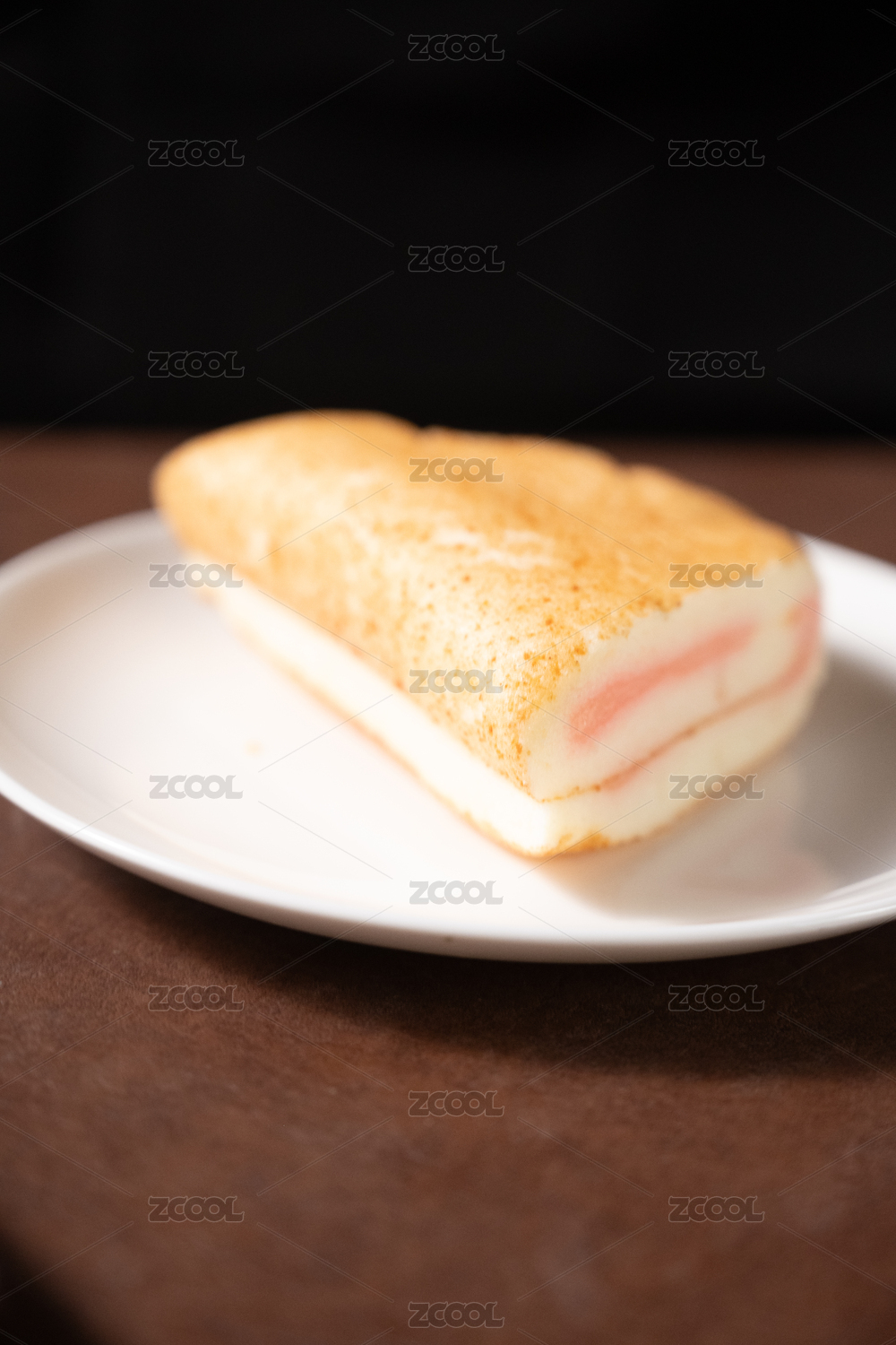 桌面上的盘子里的美味可口的草莓蛋糕卷