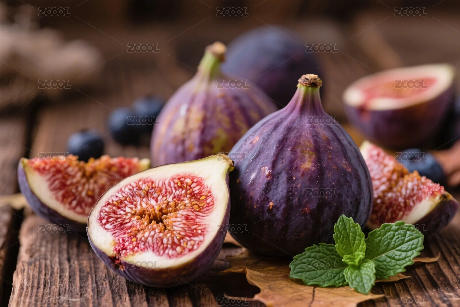 木桌上摆放的新鲜无花果