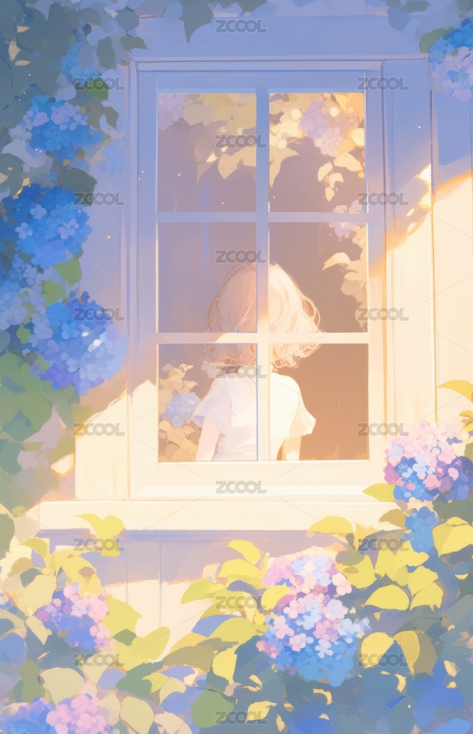 春天白天阳光下门窗外粉花绿色原野3D插画