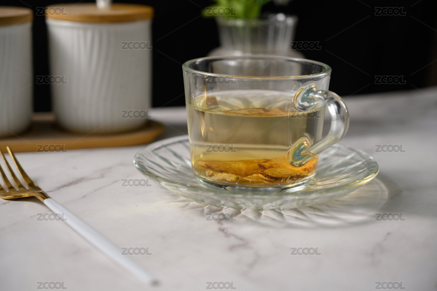 桌面上的杯子里的甘甜可口的夜交藤茶