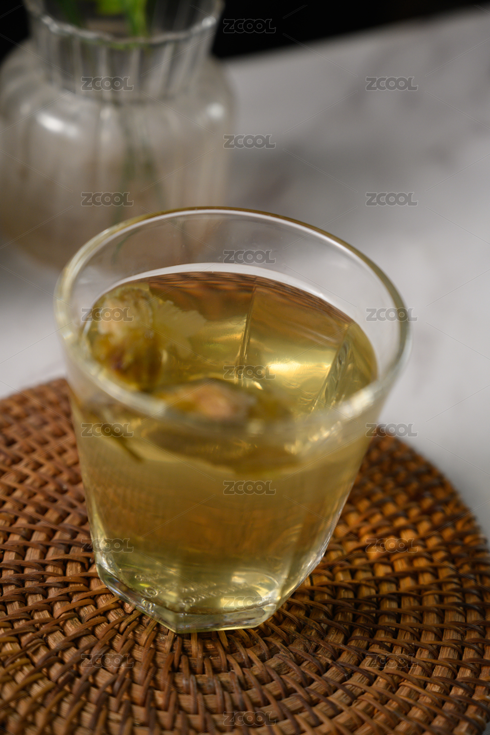 桌面上的杯子里的甘甜可口的金盏菊花茶