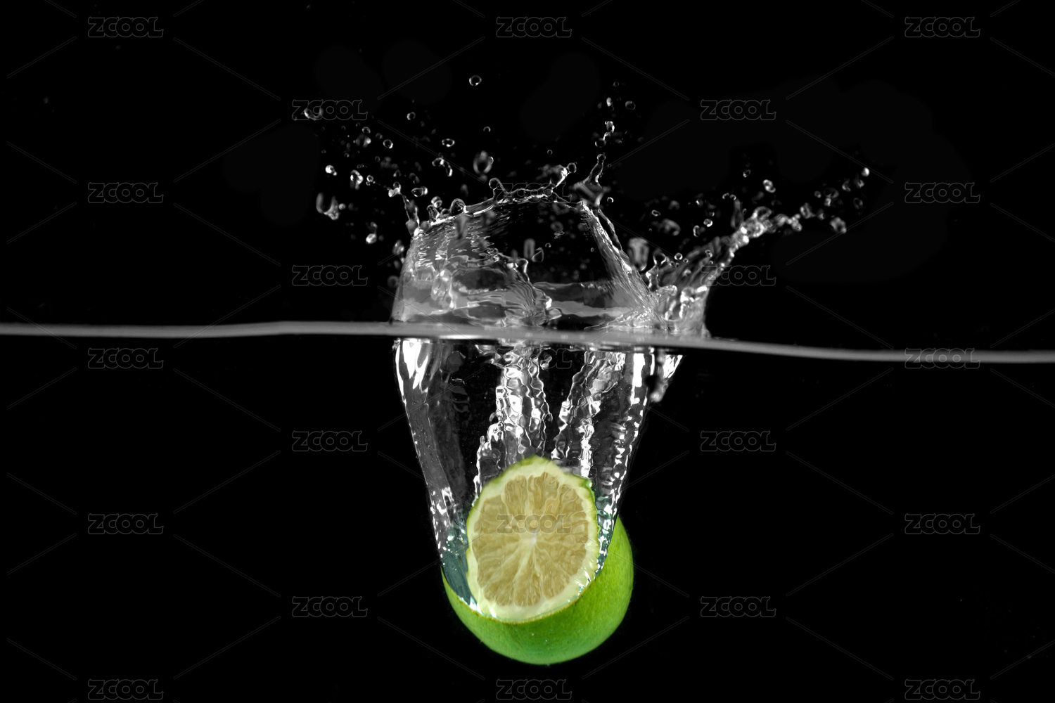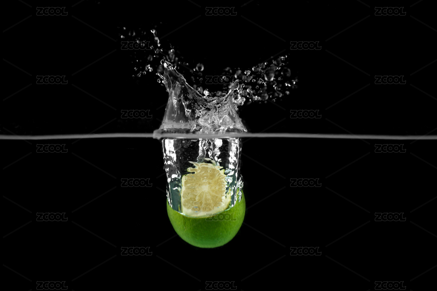 一颗青柠檬掉落水中激起了水花