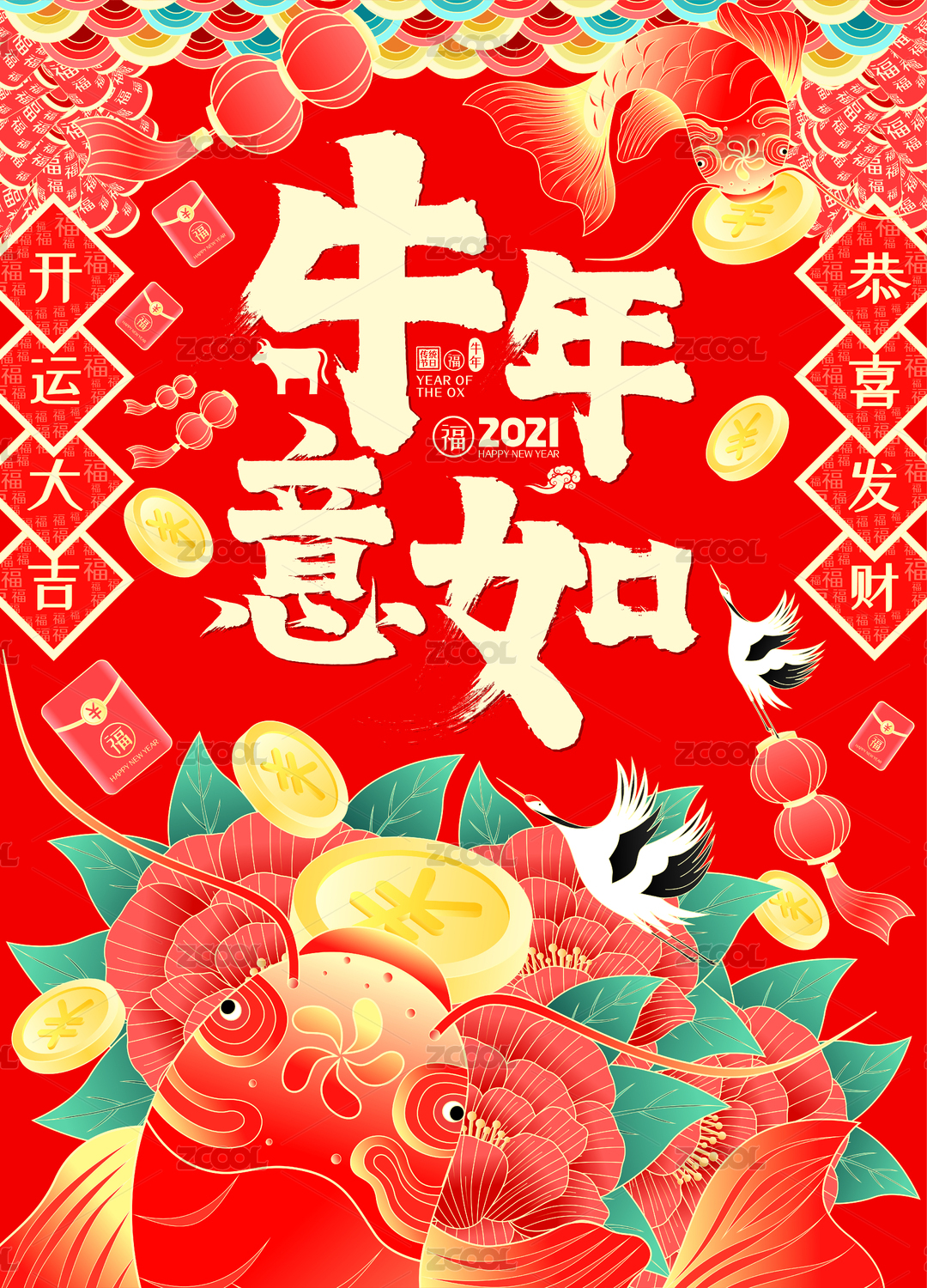 牛年如意锦鲤牡丹赐福开运春节矢量插画海报