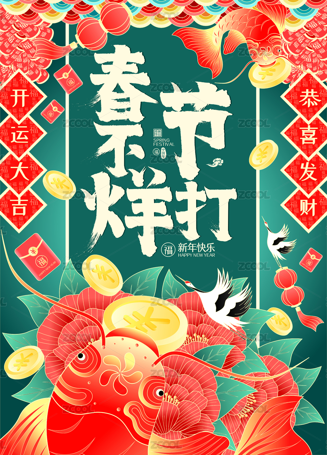 过年不打烊锦鲤牡丹仙鹤送福开运春节海报