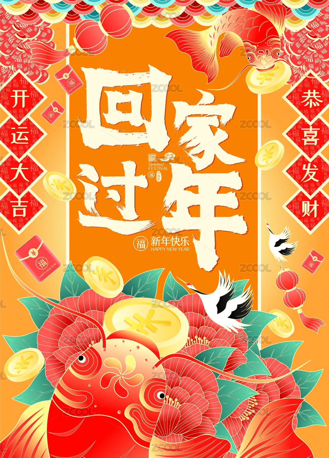 回家过年锦鲤牡丹仙鹤送福开运春节海报