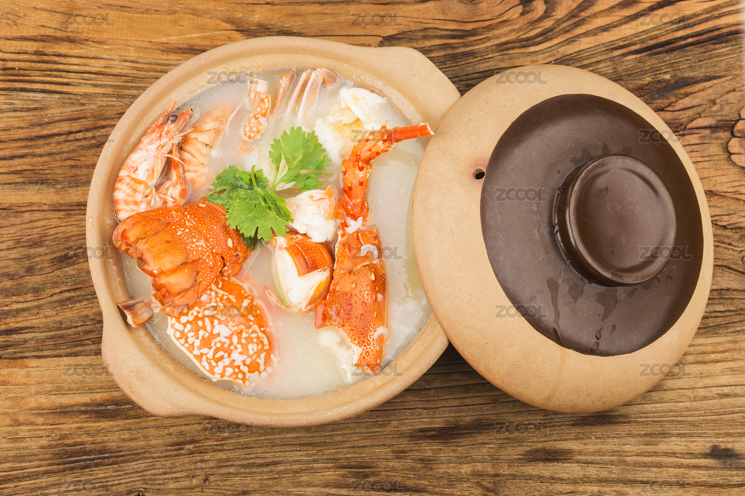 木桌上的一锅海鲜粥,中国潮汕砂锅粥