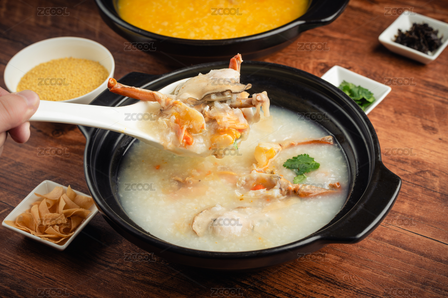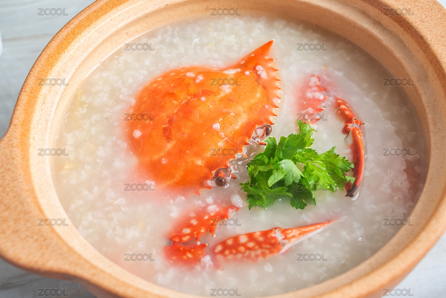 中国美食海鲜粥,厨房台面上一锅螃蟹粥