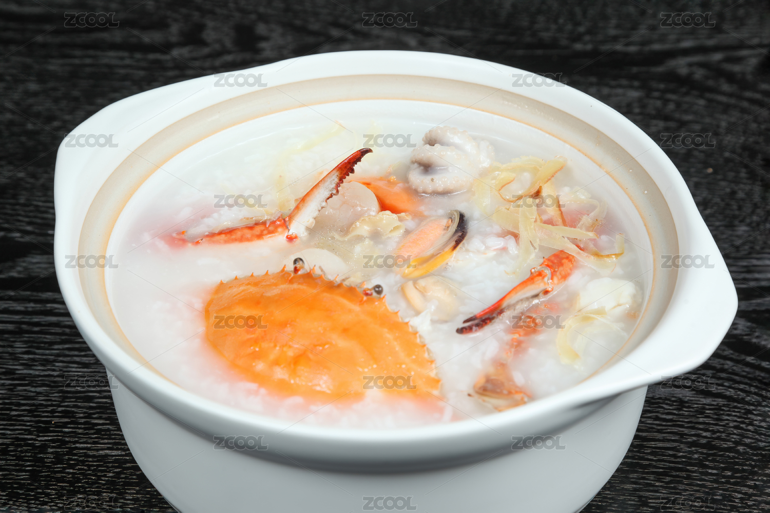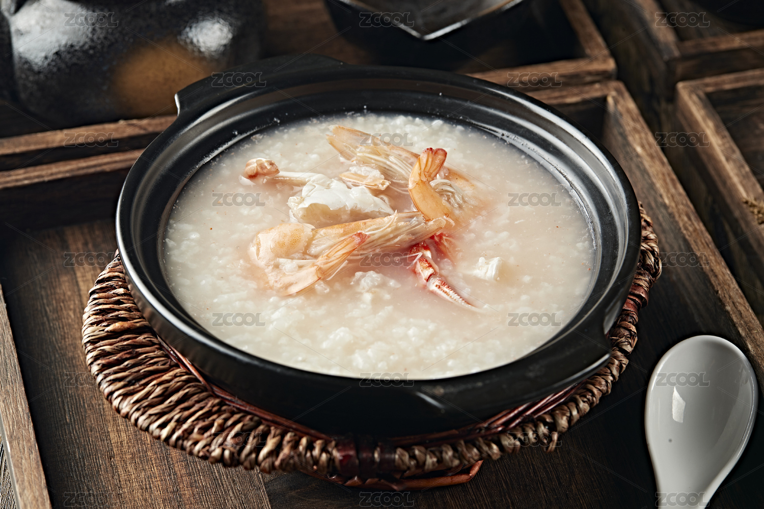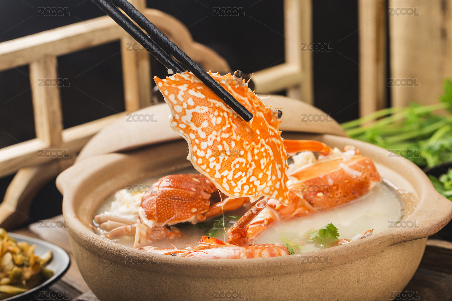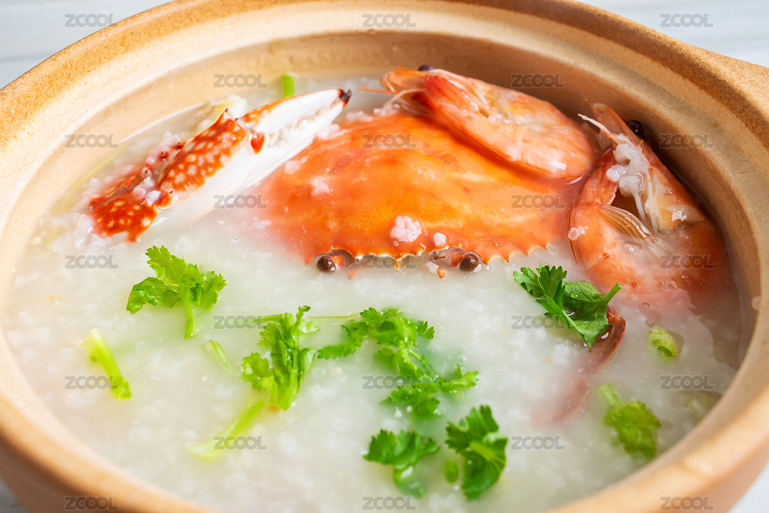 中国潮汕砂锅粥,虾蟹海鲜粥特写