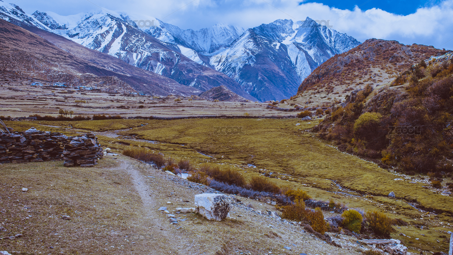 中国西藏青藏铁路沿线念青唐古拉山下的藏寨