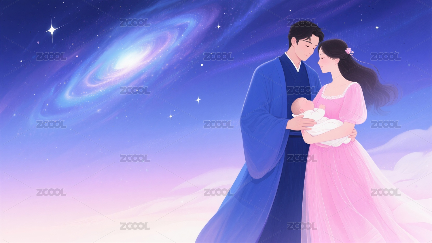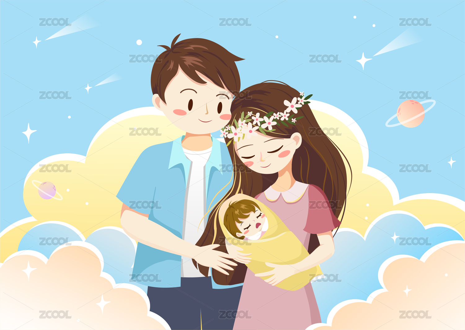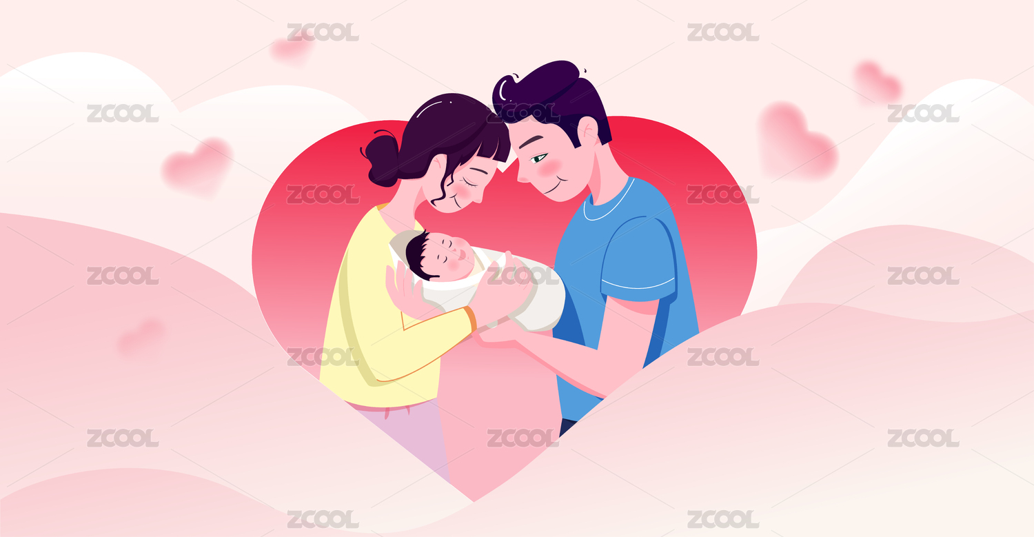 年轻夫妻怀抱着孩子在睡梦中插画
