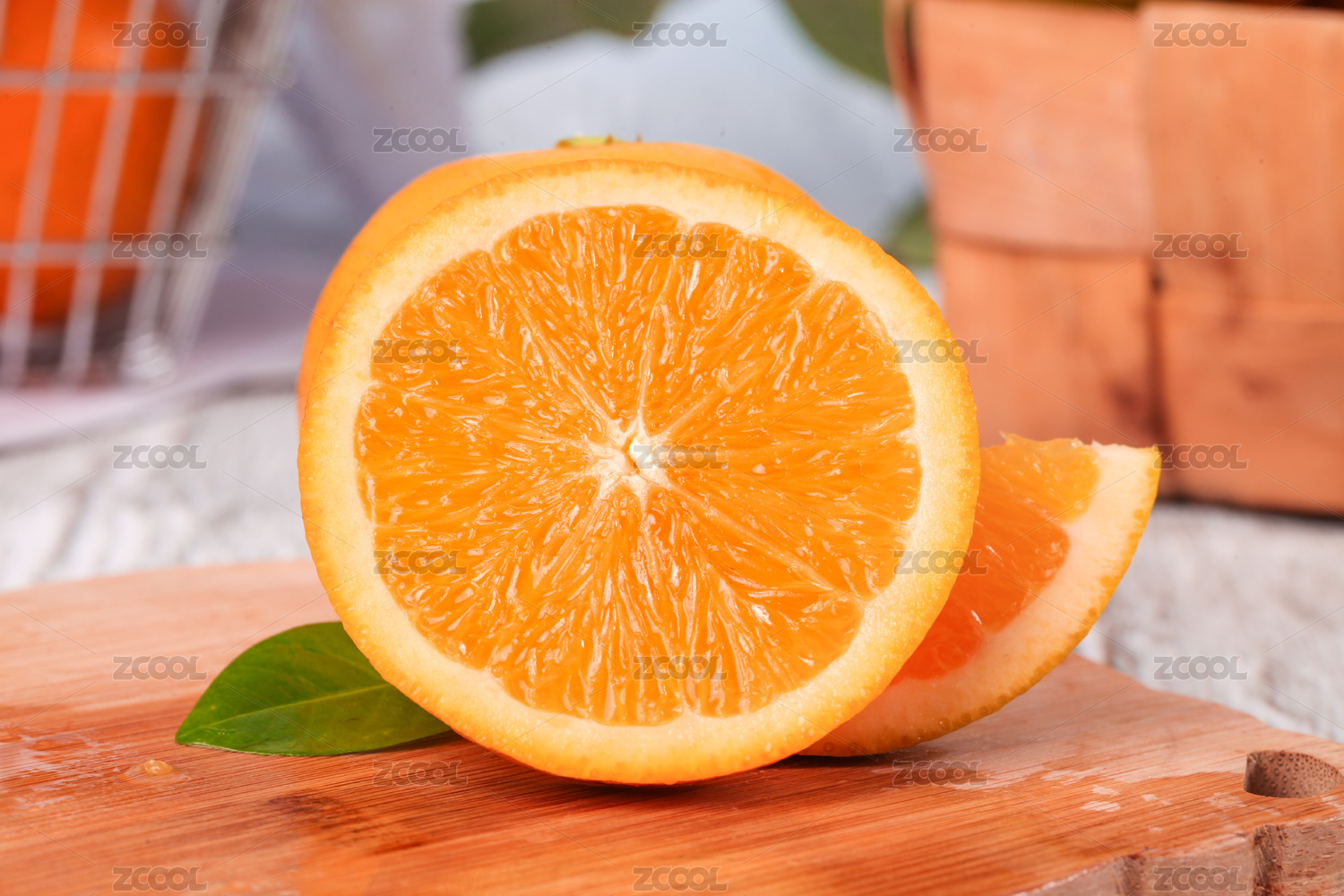 木底上放着一个完整的砂糖桔和一块切面蜜桔