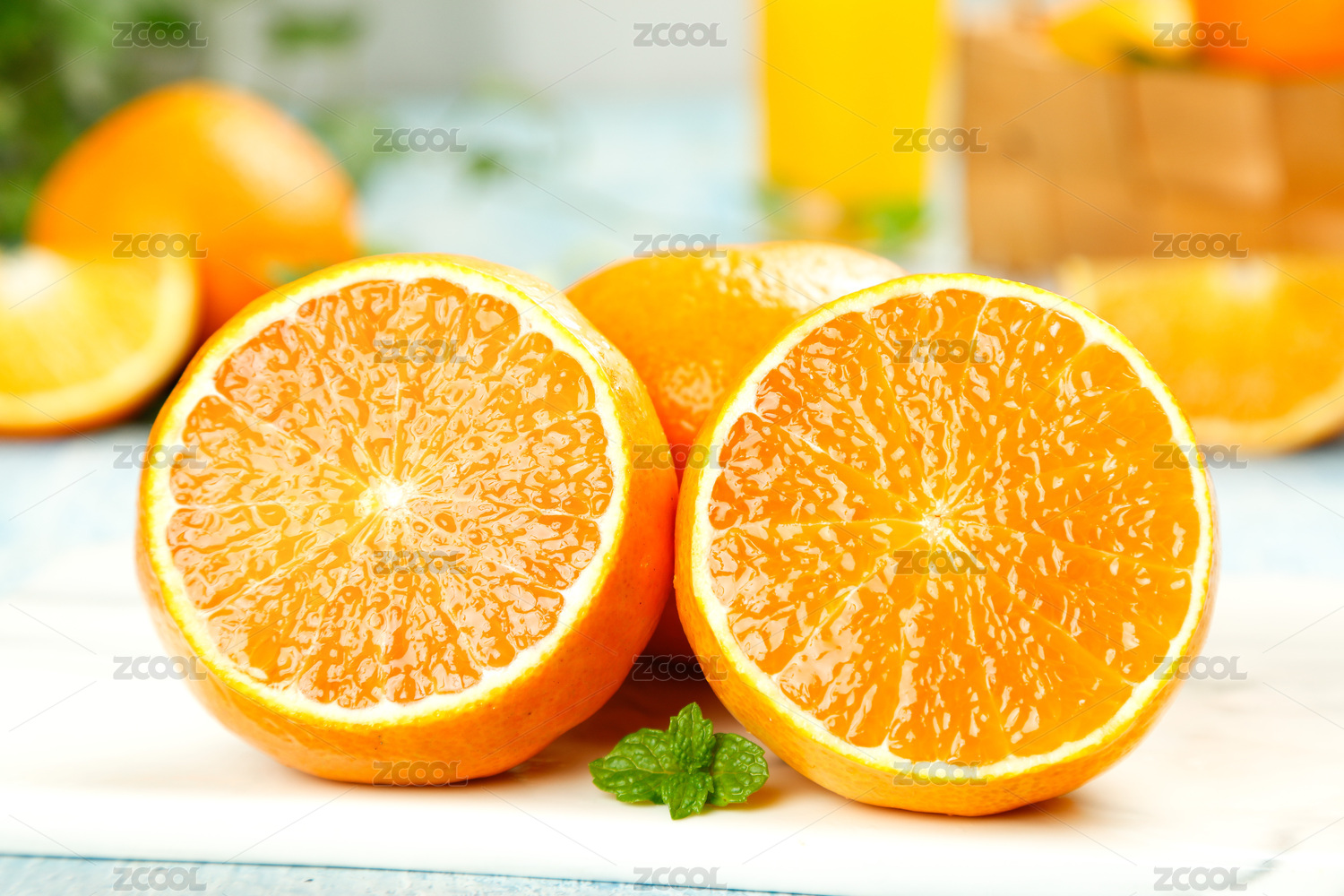 白石板上放着一个冰糖橙和两个切面的果冻橙