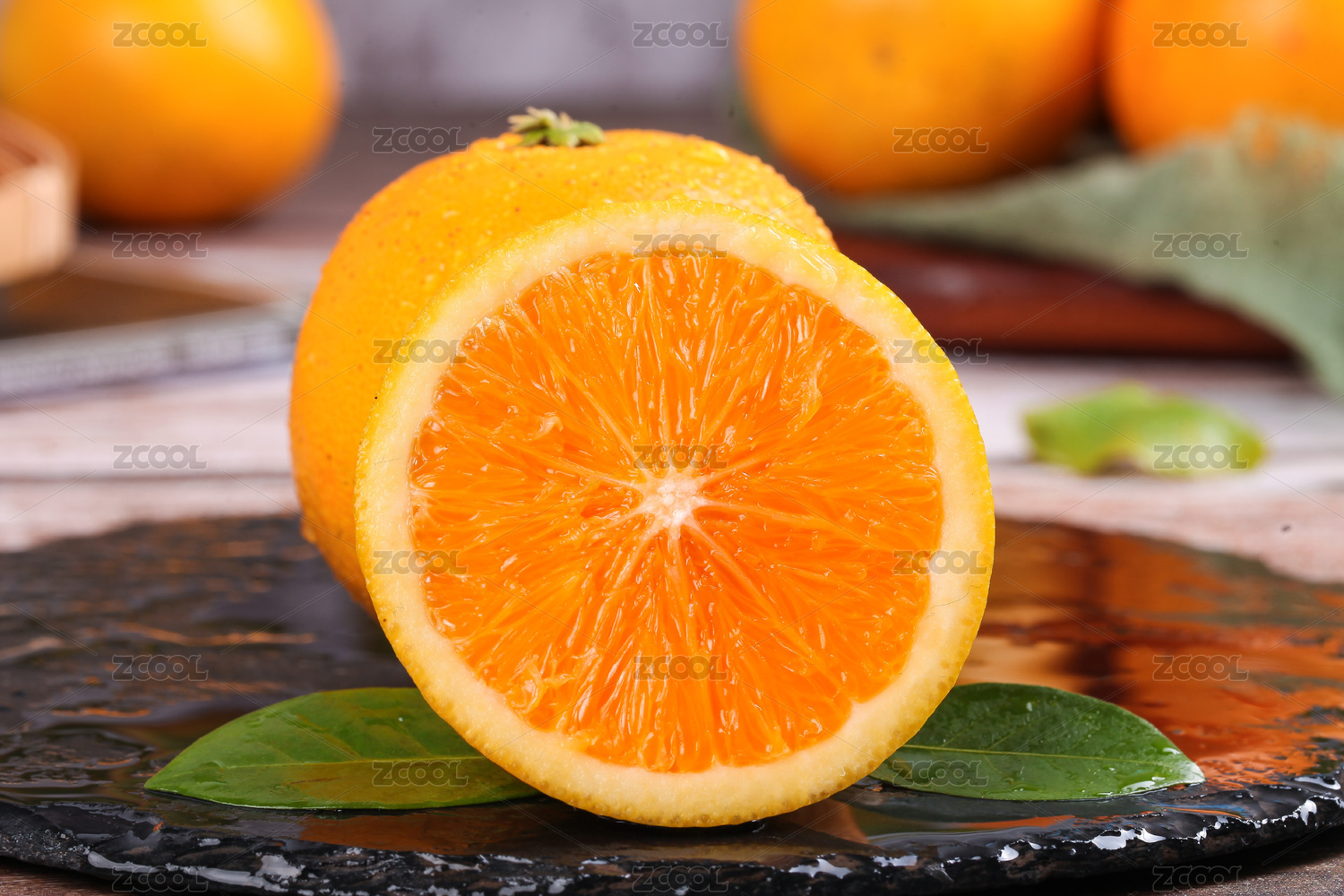 黑石板上放着两个麻阳冰糖橙和切片的橙子