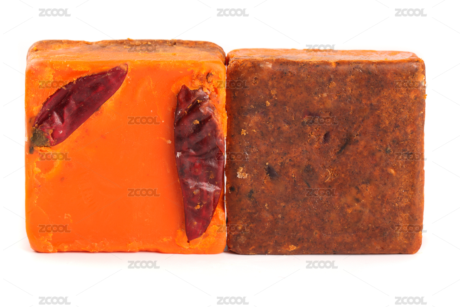 白底上两块两种菌汤火锅底料和麻辣火锅底料