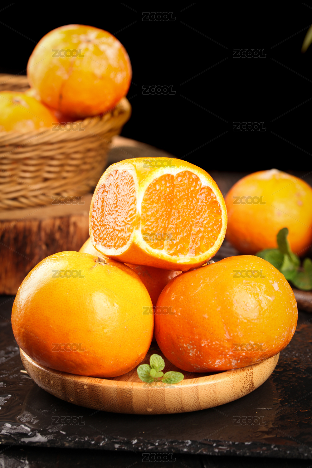 木板上放着一堆新鲜沃柑和切片的蜜橘